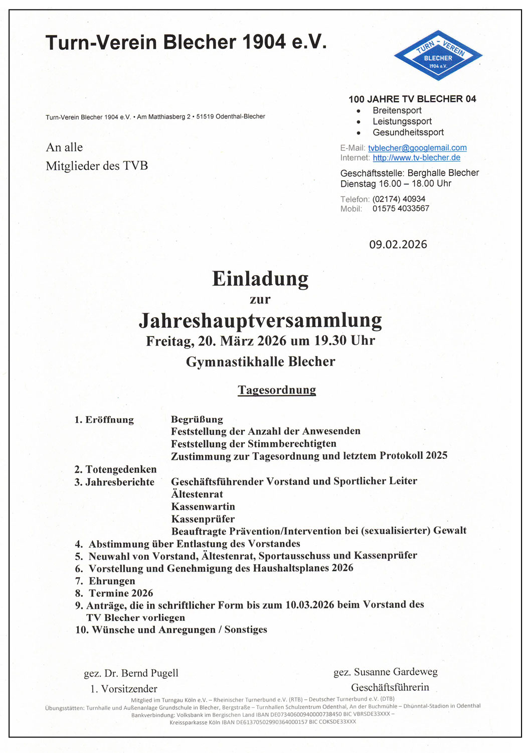Liebe Mitglieder, wir laden euch herzlich zur diesjährigen Jahreshauptversammlung am Freitag, den 20. März 2026, um 19:30 Uhr in der Gymnastikhalle der KGS Blecher ein.