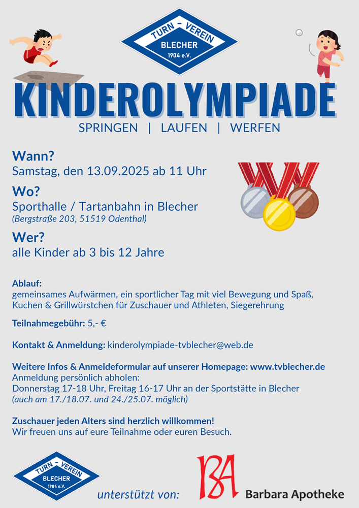 Am Samstag, den 13. September 2025, lädt der TV Blecher alle Kinder im Alter von 3 bis 12 Jahren herzlich zur großen Kinderolympiade ein! Unter dem Motto "Springen | Laufen | Werfen" erwarten euch Bewegung, Spaß und sportlicher Ehrgeiz auf der Tartanbahn und in der Sporthalle in Blecher. Anmeldeformular auszufüllen und an kinderolympiade-tvblecher@web.de senden. | ![]() |